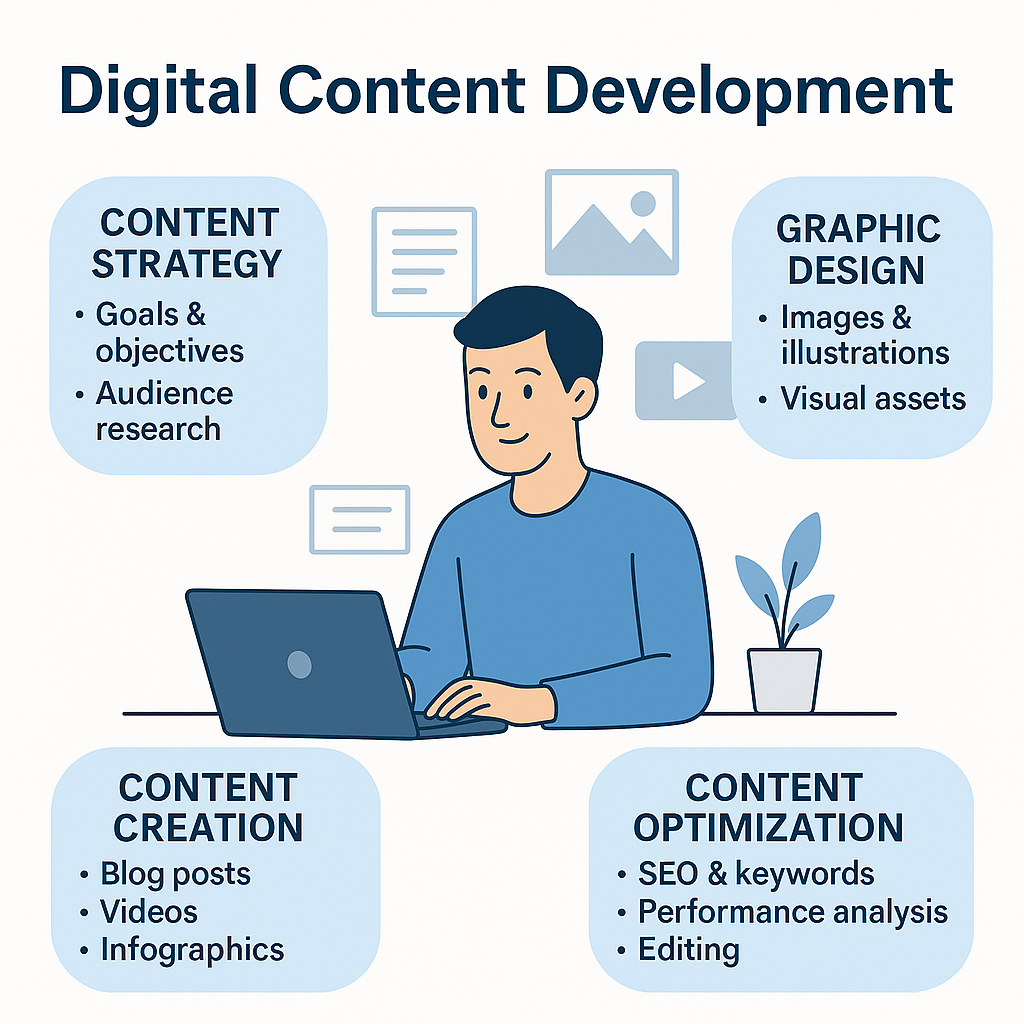 Digital content development focuses on creating high-quality, engaging, and purpose-driven content for online platforms. It includes planning, designing, and producing various digital assets that support learning, marketing, communication, and brand growth. Content is crafted using modern tools, creativity, and data-driven strategies to meet user needs and achieve business goals.
